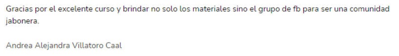Estoy muy agradecida con la profesora el curso, pense que seria dificil conseguir los materiales y elaborarlos pero es realmente sencillo siguiendo toda la explicación y el paso a paso, yo lo compre porque quieri tener mi propio negocio de jabones artesanales.